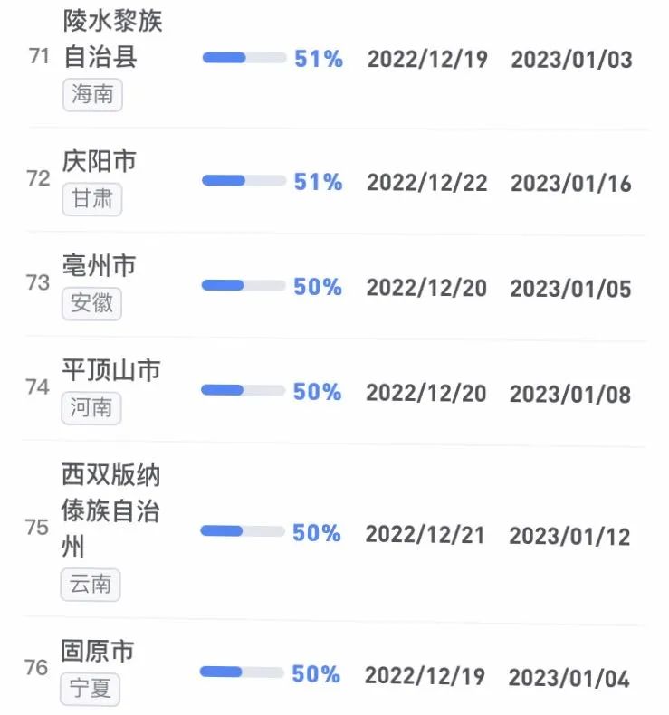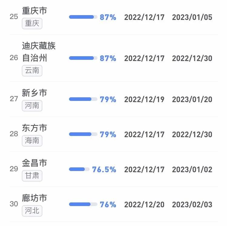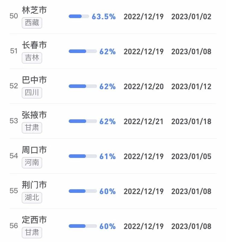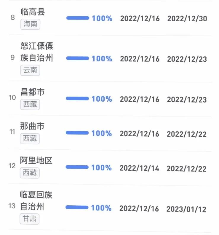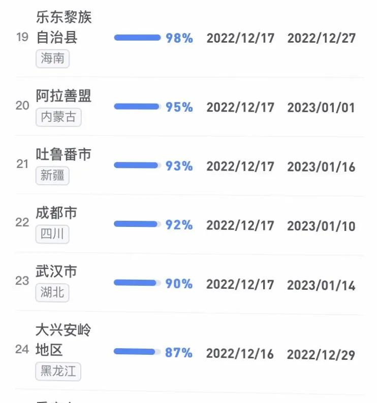 據不完全統計,全國感染進度100%的城市已累計達17個,其中石家莊市、保定市、甘南藏族自治州、克孜勒蘇柯爾克孜自治州均在12日就達到首輪感染峰值。成都市、武漢市等76個市達峰進度已超過50%。