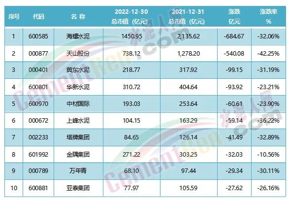 從水泥行業A股20家主流上市公司來看,市值蒸發達一千多億。