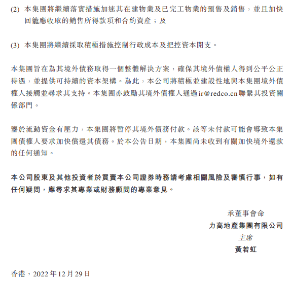 另一家,多年位列中國地產TOP100的力高集團,也在2022年的最后一個工作日發布公告,鑒于流動資金有壓力,將暫停境外債務付款。公司將盡最大的努力保證正常運營及交樓。