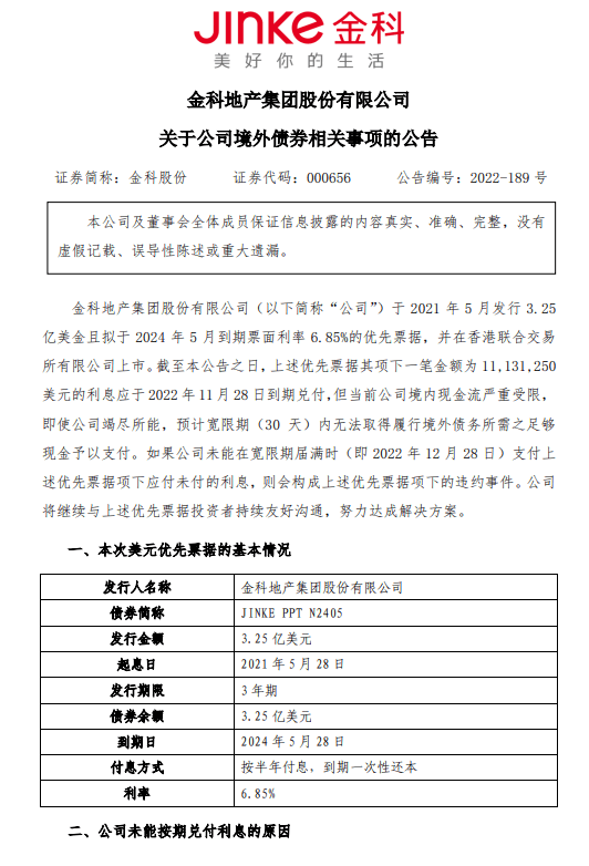12月28日,金科股份公告稱,一筆金額約1113.125萬美元的利息應于 2022年11月28日到期兌付,但當前公司境內現金流嚴重受限,即使公司竭盡所能,預計寬限期30天內無法取得履行境外債務所需之足夠現金予以支付。