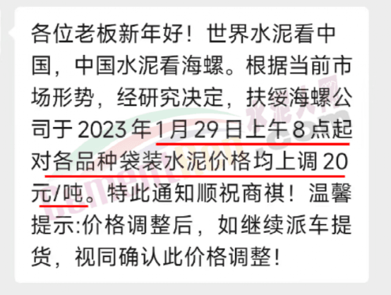 南寧區域水泥經銷商發調價通知稱,自2023年1月29日對紅獅、臺泥、魚峰、潤豐、海螺等各規格包裝水泥價格在原基礎上上調20元/噸,同時提示散裝水泥不漲價。