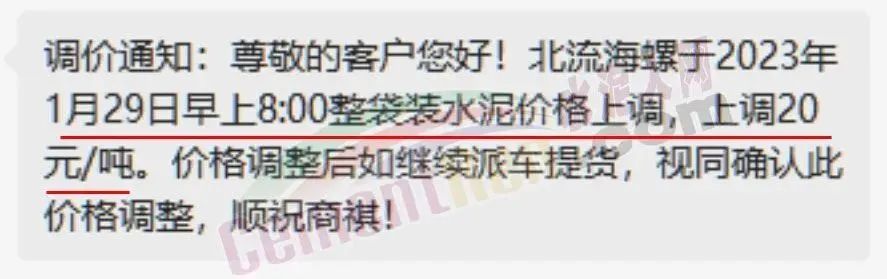 北流海螺水泥通知稱,于2023年1月29日早上8時起袋裝水泥價格上調,上調20元/噸。