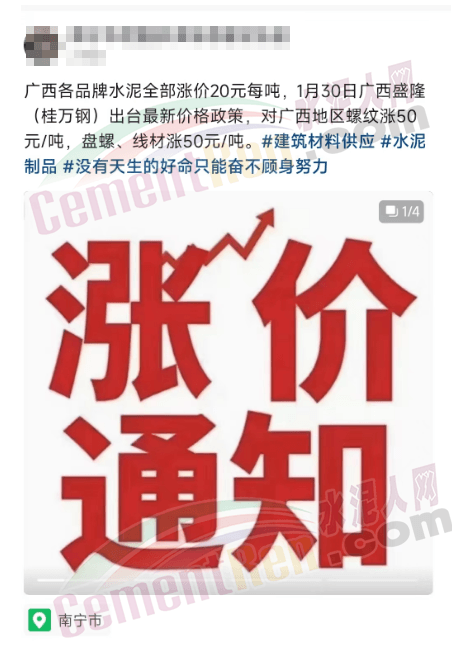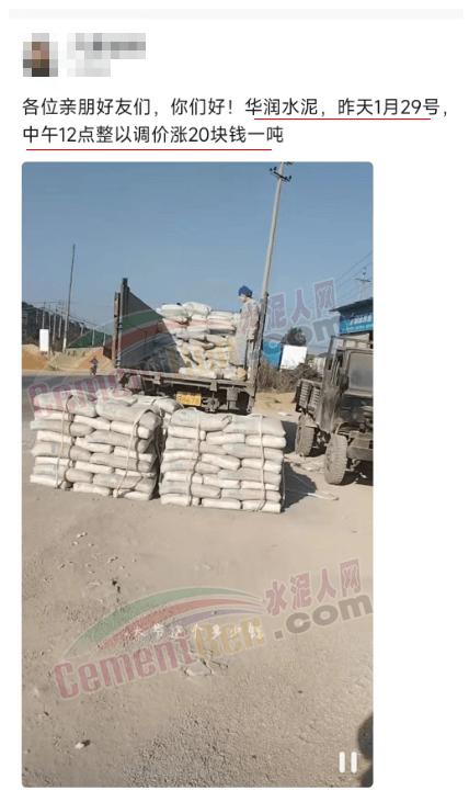 另一華潤水泥經銷商發消息確認:“華潤水泥1月29日中午12點整已調價20元/噸。”