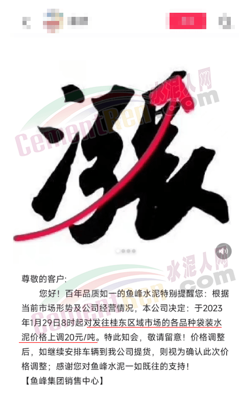 魚峰集團經銷商轉發企業銷售中心對發往桂東區域市場的各品種袋裝水泥價格上調20元/噸的通知。