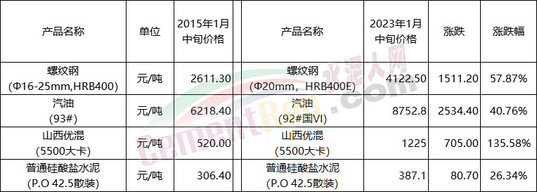 價格方面,國家統計局1月24日公布了2023年1月中旬流通領域重要生產資料市場價格變動情況。對比2015年相關數據可見,煤炭價格上漲了135.58%,螺紋鋼及汽油分別上漲了57.87%和40.76%,而P.O42.5散裝水泥價格僅上漲了26.34%。