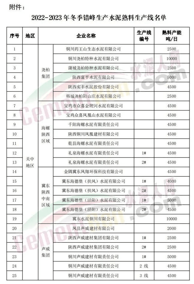 陜西省全省所有水泥熟料生產(chǎn)線2022年12月1日0 時(shí)至2023年3月10日24時(shí)期間錯(cuò)峰停產(chǎn)100天。