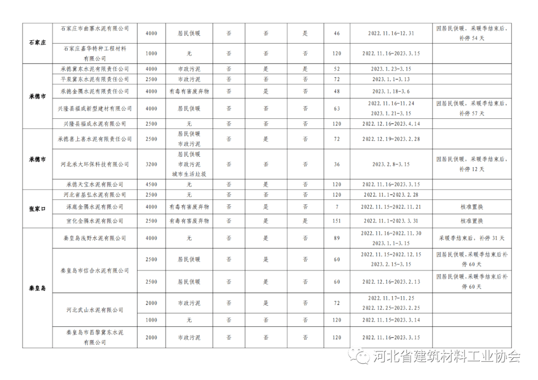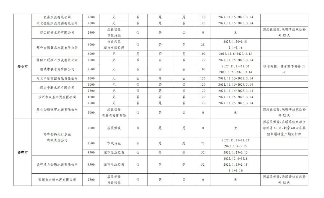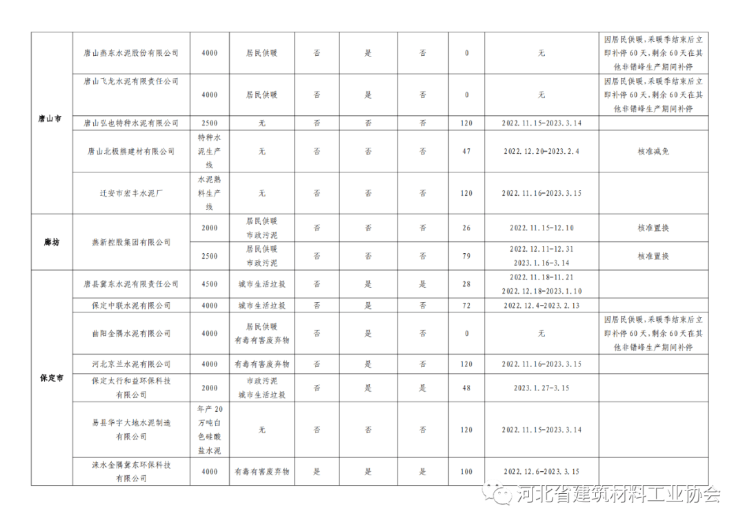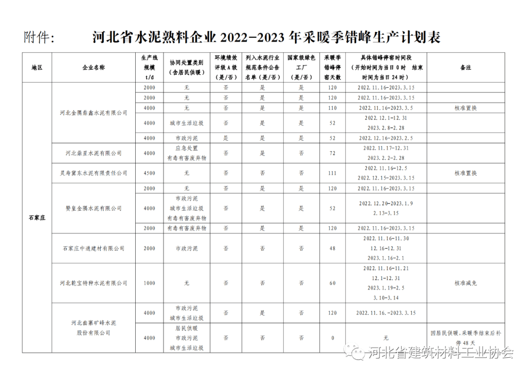 河北省水泥熟料企業(yè)從2022年開(kāi)始供暖之日至2023年開(kāi)始供暖前一日(3月14日),錯(cuò)峰天數(shù)150天。其中,采暖季120天,非采暖季30天。