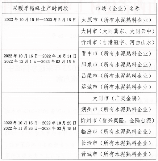 山西省除太原市外其他區(qū)域熟料生產(chǎn)線采暖季錯(cuò)峰生產(chǎn)截至到2023年3月15日結(jié)束。