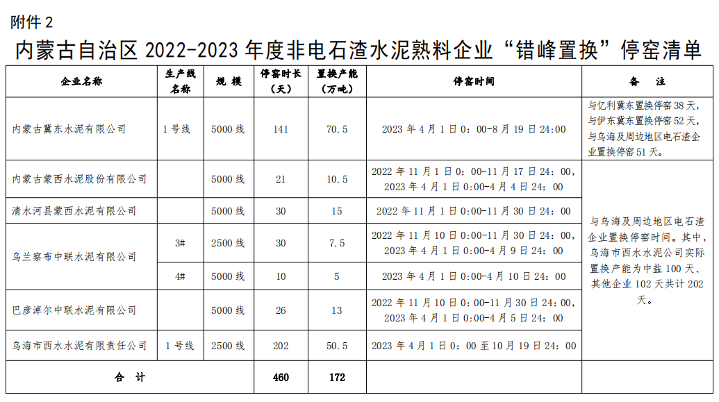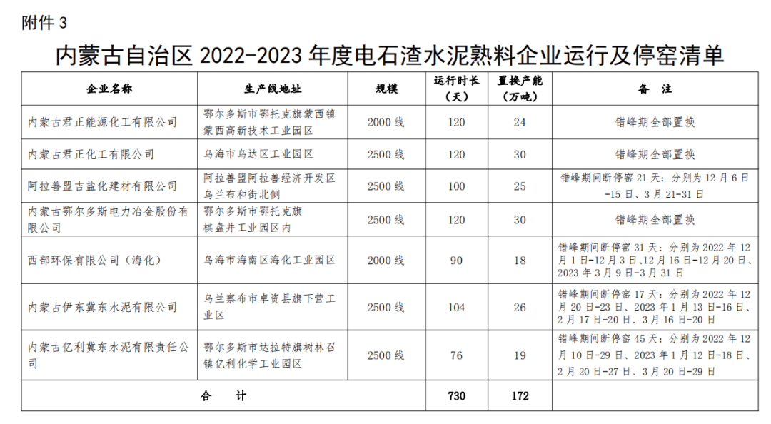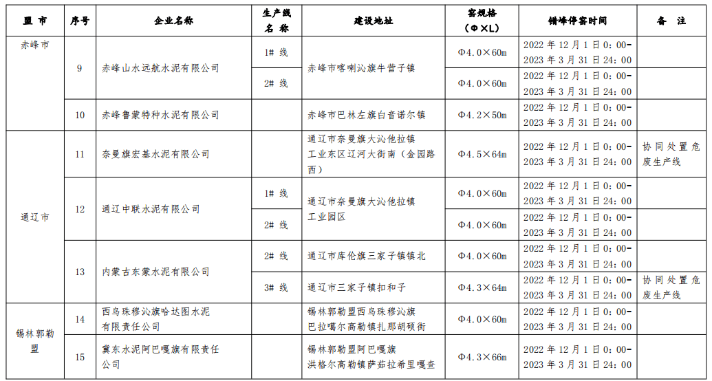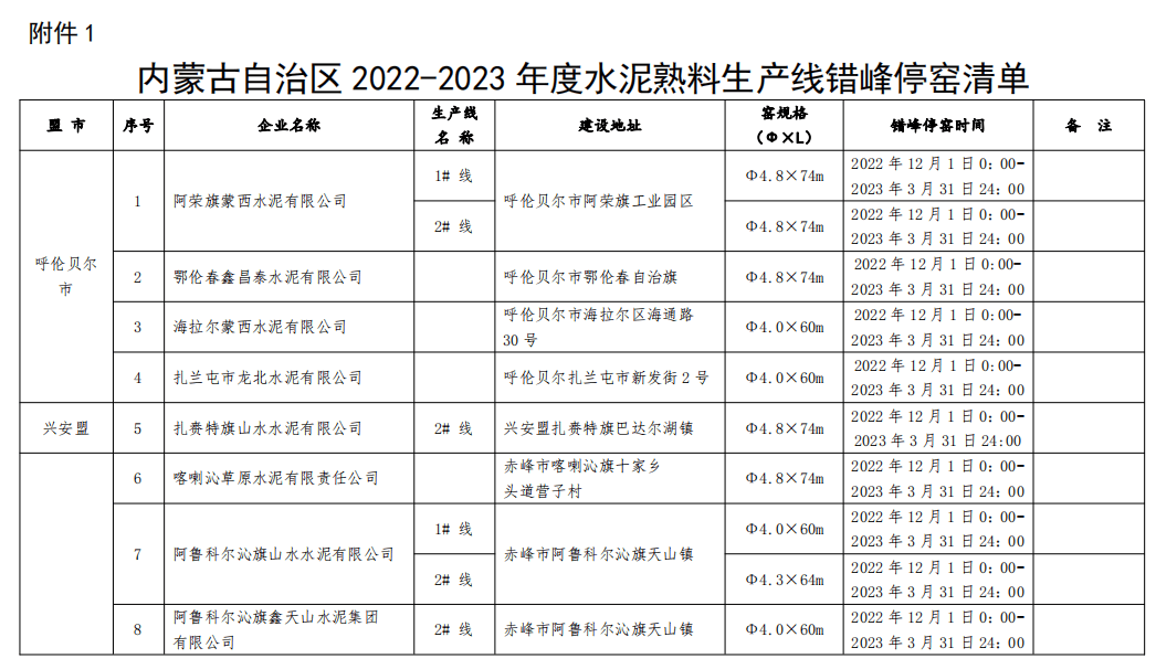內(nèi)蒙古自治區(qū)工信廳發(fā)布2022-2023年度水泥熟料生產(chǎn)線錯(cuò)峰停窯清單、非電石渣水泥熟料企業(yè)“錯(cuò)峰置換”停窯清單及電石渣水泥熟料企業(yè)運(yùn)行及停窯清單。清單顯示絕大多數(shù)生產(chǎn)線采暖季錯(cuò)峰到3月底前結(jié)束。