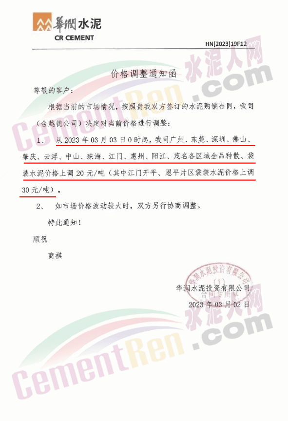 華潤水泥通知,從3月3日0時起,公司廣州、東莞、深圳、佛山肇慶、云浮、中山、珠海、江門、惠州、陽江、茂名各區域全品種散裝、袋裝水泥價格上調20元/噸,其中江門開平、恩平片區袋裝水泥價格上調30元/噸。