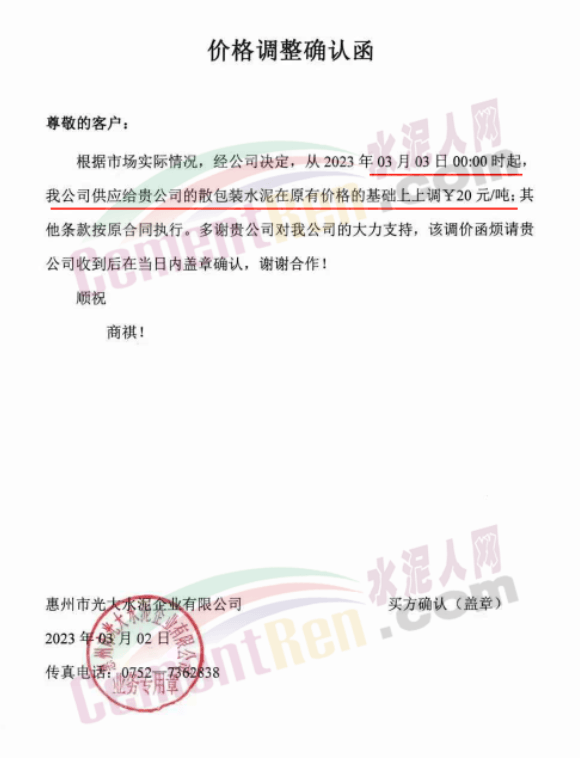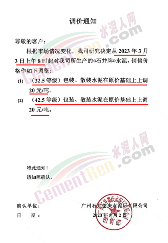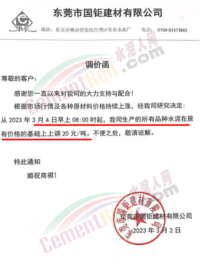 東莞市國鉅建材有限公司通知,根據市場行情及各種原材料價格持續上漲,經公司研究決定從2023年3月4日早上8時起,公司生產的所有品種水泥在原有價格的基礎上上調20元/噸。