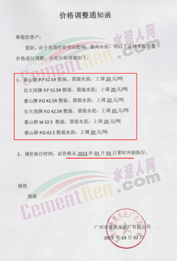 廣州市番禺水泥廠有限公司通知,從3月3日0時起各品種水泥上調20元/噸。