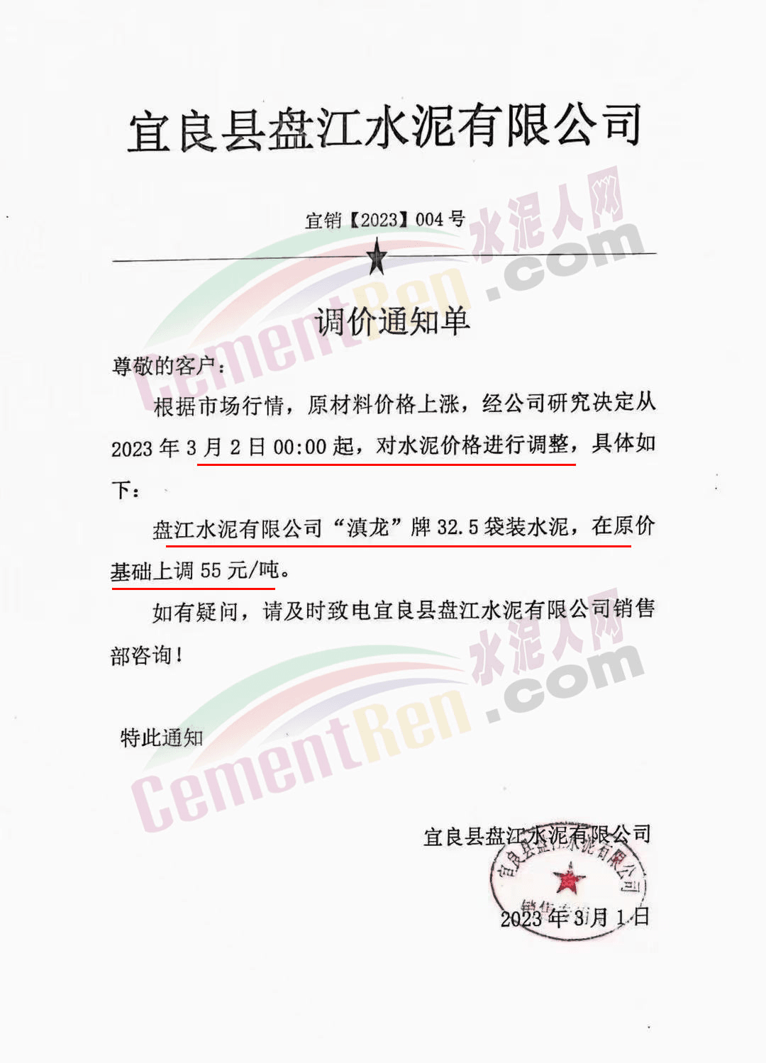 宜良縣盤江水泥有限公司通知根據市場行情,原材料價格上漲,經公司研究決定從2023年3月2日0時起,對“滇龍”牌32.5袋裝水泥,在原價基礎上調55元/噸。