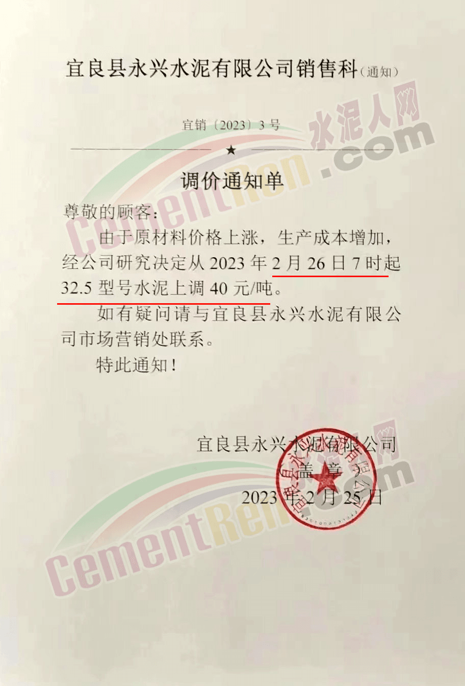 宜良縣永興水泥有限公司銷售科通知,由于原材料價格上漲,生產成本增加,經公司研究決定從2023年2月26日7時起32.5型號水泥上調40元/噸。