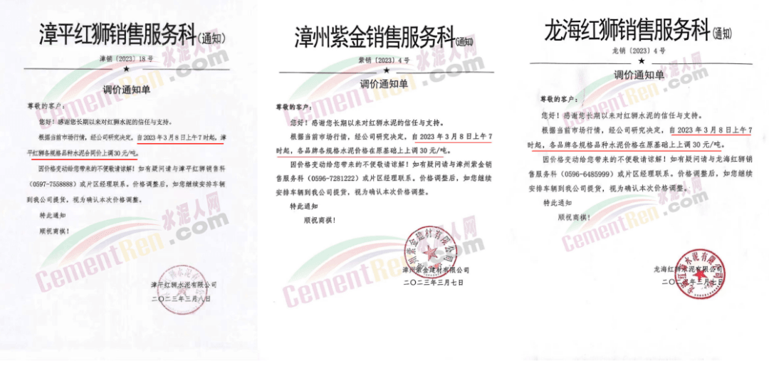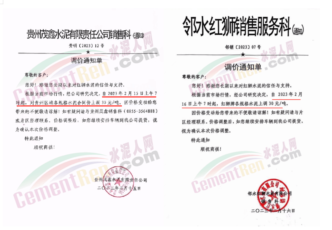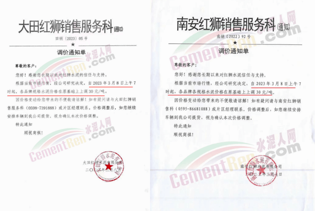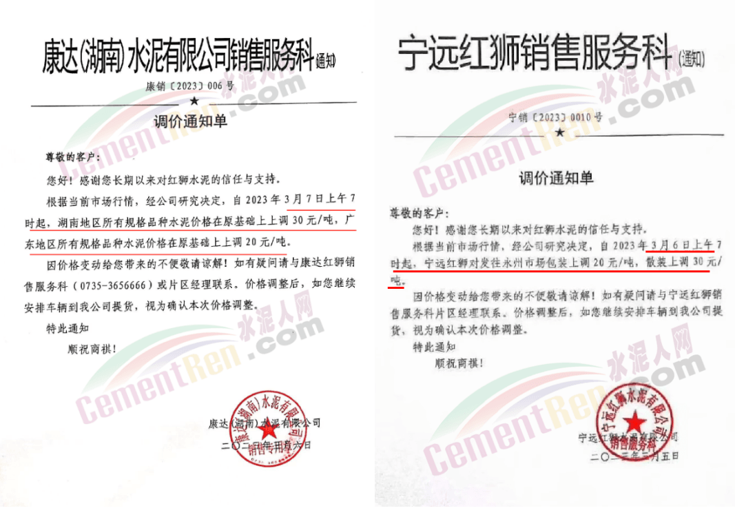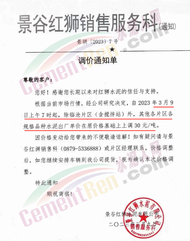日前,云南區域景谷紅獅銷售服務科通知,根據當前市場行情,經公司研究決定自2023年3月9日上午7時起,除臨滄片區(含攪拌站)外,其他各片區各規格品種水泥出廠價上調30元/噸。