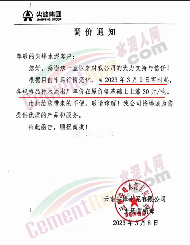 云南尖峰水泥通知,根據目前市場行情變化,自2023年3月9日零時起各規格品種水泥出廠價上調 30元/噸。