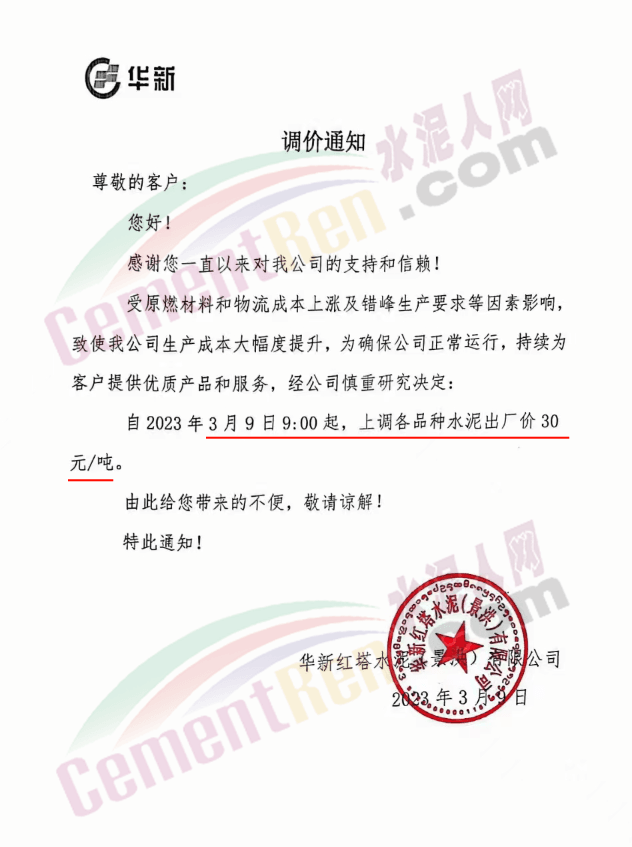 華新紅塔水泥(景洪)有限公司通知,受原燃材料和物流成本上漲及錯峰生產要求等因素影響,致使公司生產成本大幅度提升,為確保公司正常運行,持續為客戶提供優質產品和服務,經公司慎重研究決定,自2023年3月9日9時起,上調各品種水泥出廠價30元/噸。
