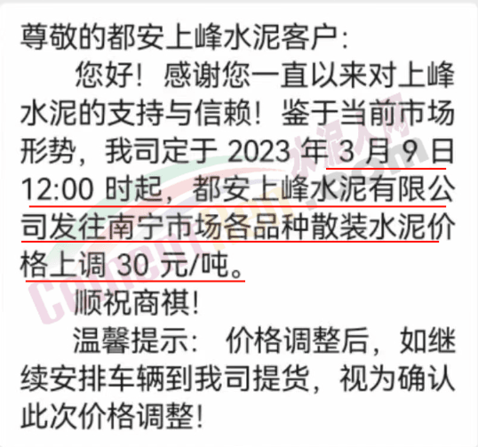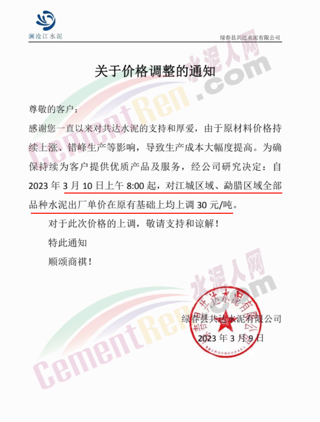 綠春共達水泥有限公司通知,由于原材料價格持續上漲、錯峰生產等影響,導致生產成本大幅度提高。為確保持續為客戶提供優質產品及服務,經公司研究決定,自2023年3月10日上午8時起,對江城區域、勐臘區域全部品種水泥出廠價上調 30元/噸。