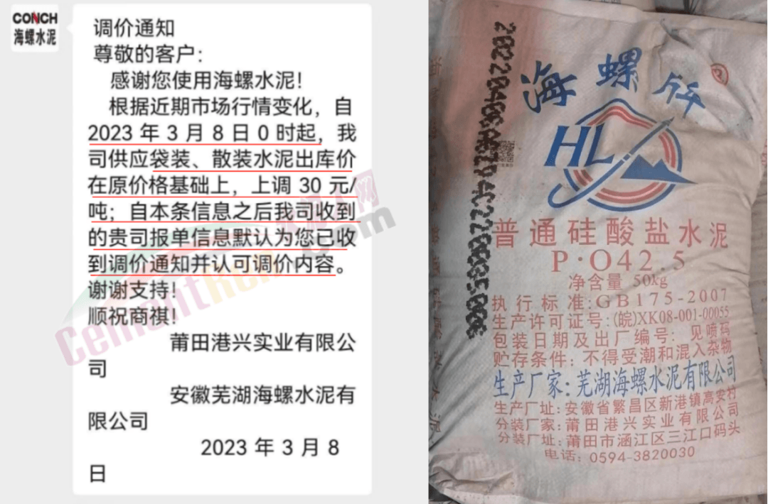 日前,莆田港興實業有限公司和安徽蕪湖海螺水泥有限公司聯合發消息稱,根據近期市場行情變化,自2023年3月8日0時起,公司供應袋裝、散裝水泥出庫價在原價格基礎上上調30元/噸。