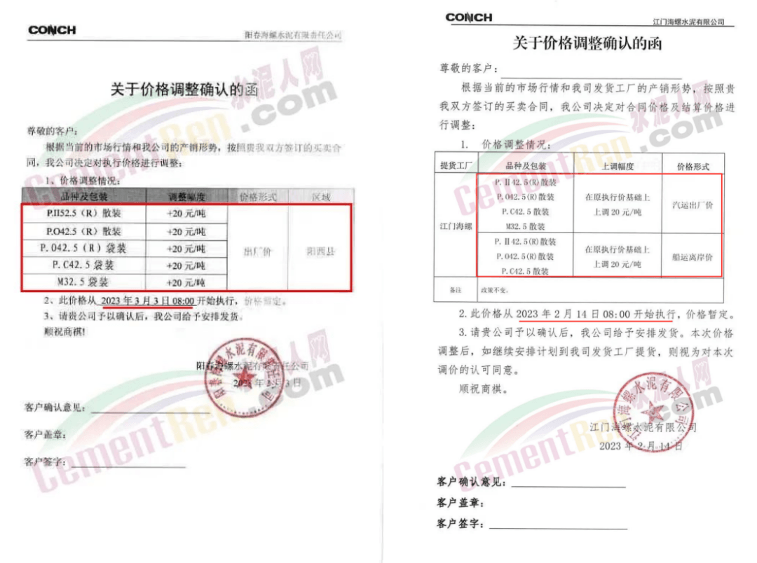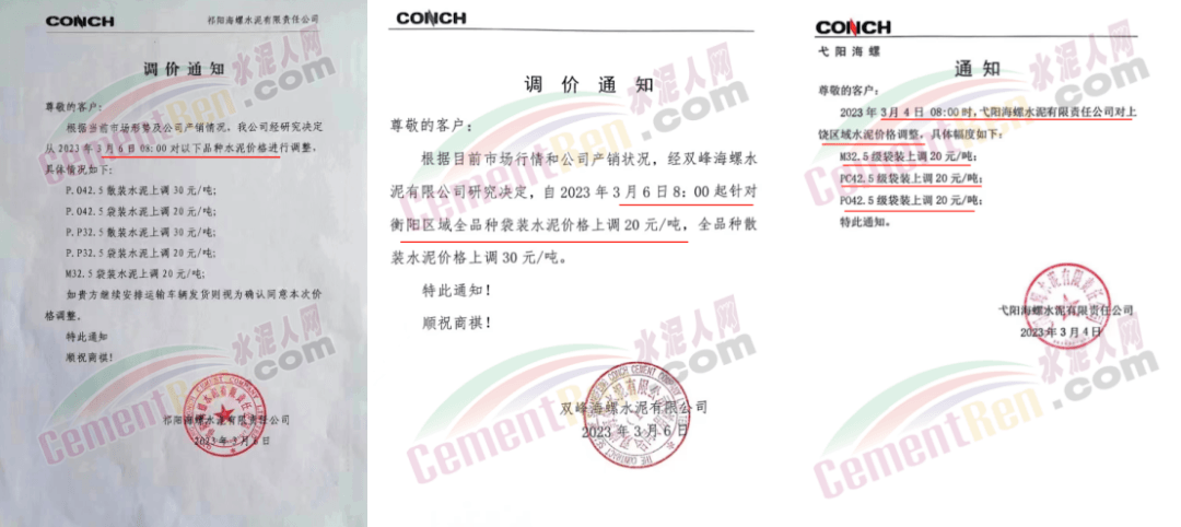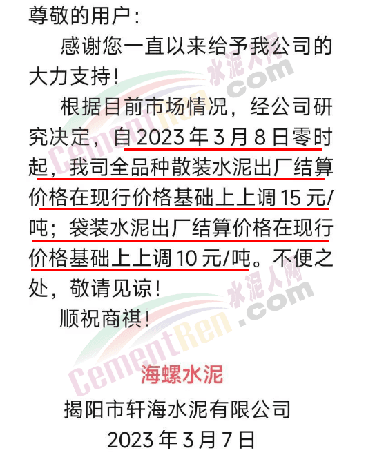 經銷海螺水泥的揭陽市軒海水泥有限公司通知,根據目前市場情況,經公司研究決定,自2023年3月8日零時起,公司全品種散裝水泥出廠結算價格在現行價格基礎上上調15元噸;袋裝水泥出廠結算價格在現行價格基礎上上調10元/噸。
