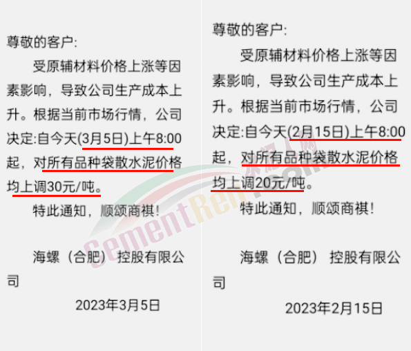 海螺(合肥)控股有限公司分別于2月15日和3月5日通知上調水泥價格20元/噸、30元/噸,兩次累計上調50元/噸。