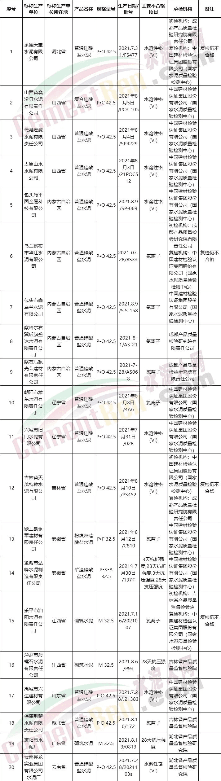 其中,國抽不合格企業名單共包含21家水泥企業。主要不合格項目為抗壓、抗折強度以及氯離子和水溶性鉻,且不合格企業中4家企業復檢仍不合格。
