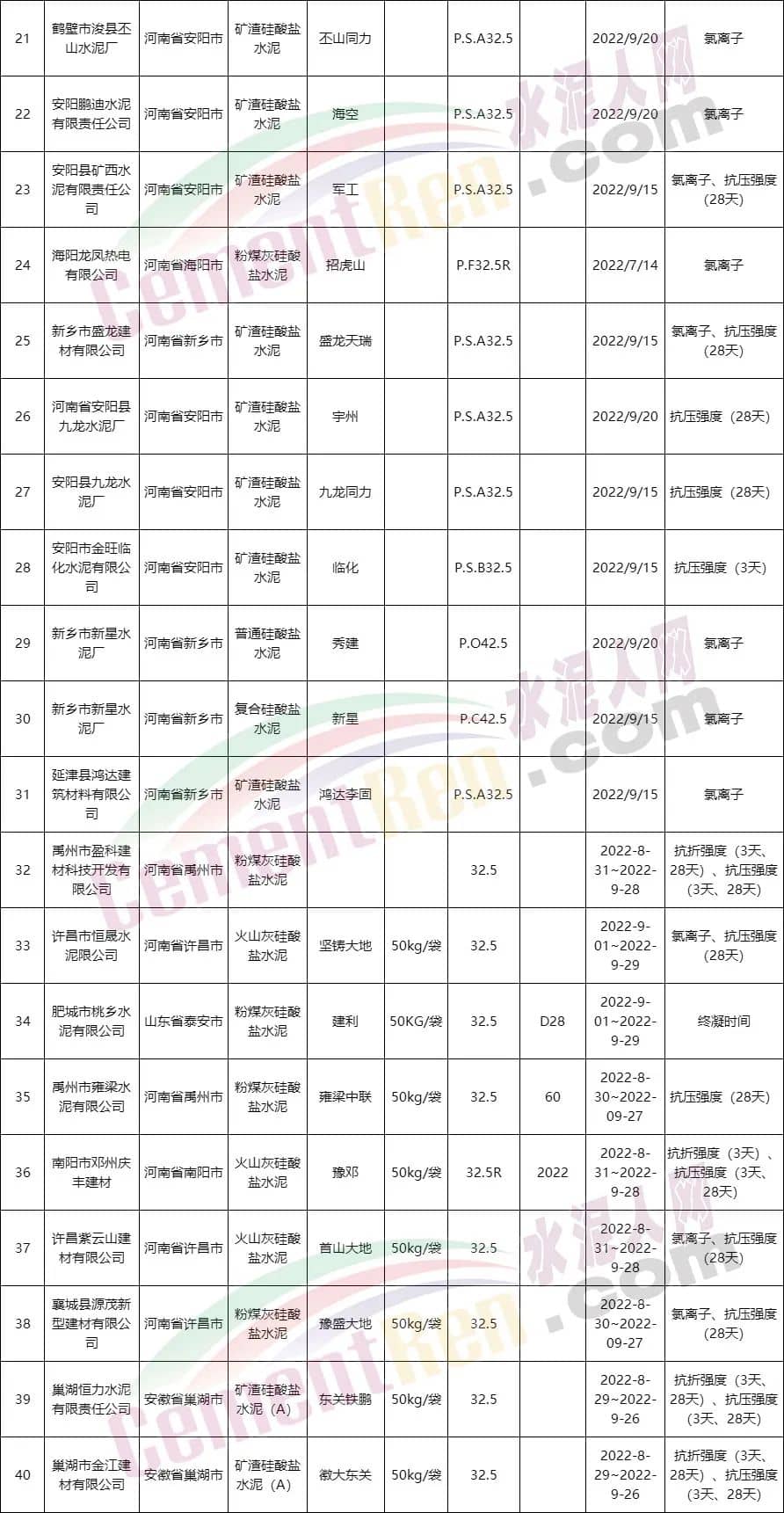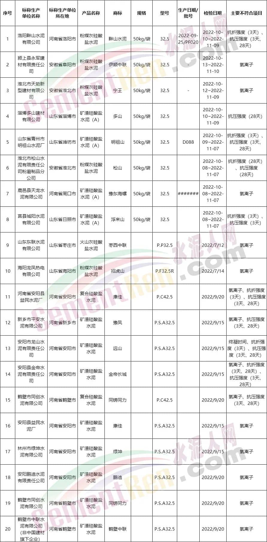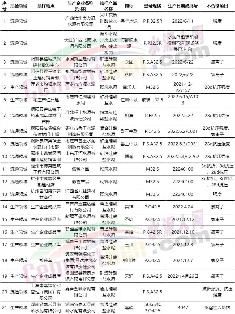 21個批次不合格品中,11個批次強度不合格,9個批次氯離子不合格,1個批次水溶性六價鉻不合格。不合品有12個批次是在流通領域被發現,9個批次為生產領域抽檢發現。其中包括32.5標號水泥13個批次,42.5水泥8個批次。不合格品中不僅包含高仿品牌、無效注冊商標,還存在兩批次“假冒產品”。