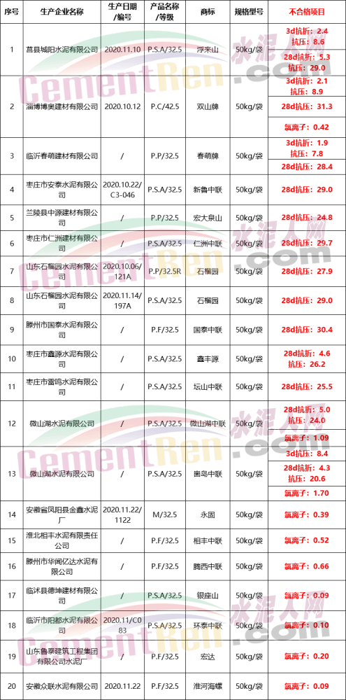 據水泥人網此前消息,水泥質量萬里行組委會對山東、江蘇、安徽等多個水泥大省流通領域第一階段性抽檢中共檢出不合格水泥20批次,不合格率高達23.5%。其中抗壓、抗折強度不合格13個批次,氯離子含量超標不合格10個批次。在檢出的不合格水泥中,部分批次28天抗折強度僅為4.3MPa;28天抗壓強度也只有20.6MPa;氯離子達到了1.70,超出國家標準28倍,且個別批次水泥出現多個項目不合格。
