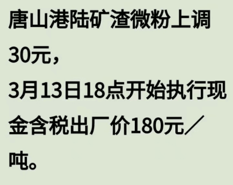 唐山港陸礦渣微粉上調30元,自3月13日18點開始執行現金含稅出廠價180元/噸。