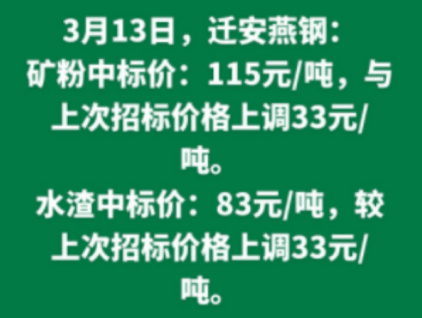 貿易商通知,3月13日,遷安燕鋼礦粉中標價:115元/噸,與上次招標價格上調33元噸。水渣中標價:83元/噸,較上次招標價格上調33元噸。