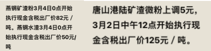 燕鋼礦渣粉3月4日0點開始執行現金含稅出廠價82元/噸。燕鋼水渣3月4日0點開始執行現金含稅出廠價50元/噸。