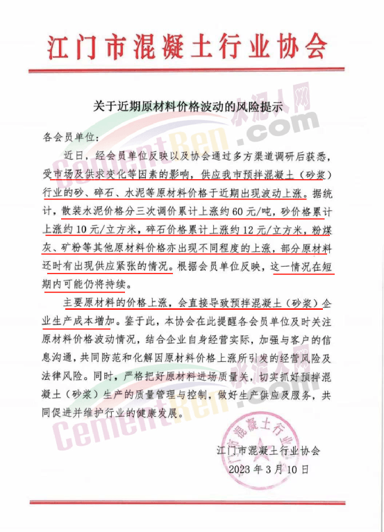 日前,江門市混凝土行業協會發布《關于近期原材料價格波動的風險提示》給各會員單位稱:近日,經會員單位反映以及協會通過多方渠道調研后獲悉,受市場及供求變化等因素的影響,供應江門市預拌混凝土(砂漿)行業的砂、碎石、水泥等原材料價格于近期出現波動上漲。據統計,散裝水泥價格分三次調價累計上漲約60元/噸,砂價格累計上漲約10元/立方米,碎石價格累計上漲約12元/立方米,粉煤灰、礦粉等其他原材料價格亦出現不同程度地上漲,部分原材料還時有出現供應緊張的情況。根據會員單位反映,這一情況在短期內可能仍將持續。