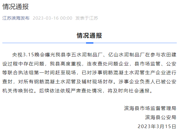 據“江蘇濱海發布”微信號16日0時消息,濱海縣市場監督管理局、濱海縣公安局通報稱,央視“3.15”晚會曝光濱海縣李五水泥制品廠、億山水泥制品廠在參與農田建設過程中存在問題,濱海縣高度重視,連夜查處問題企業,縣市場監管、公安等聯合執法組第一時間趕至現場,已對涉事鋼筋混凝土水泥管生產企業進行查封,對所有鋼筋混凝土水泥管及輔材現場封存。涉事企業負責人已被公安機關傳喚到位。后續依法依規嚴肅查處情況,將及時向社會通報。