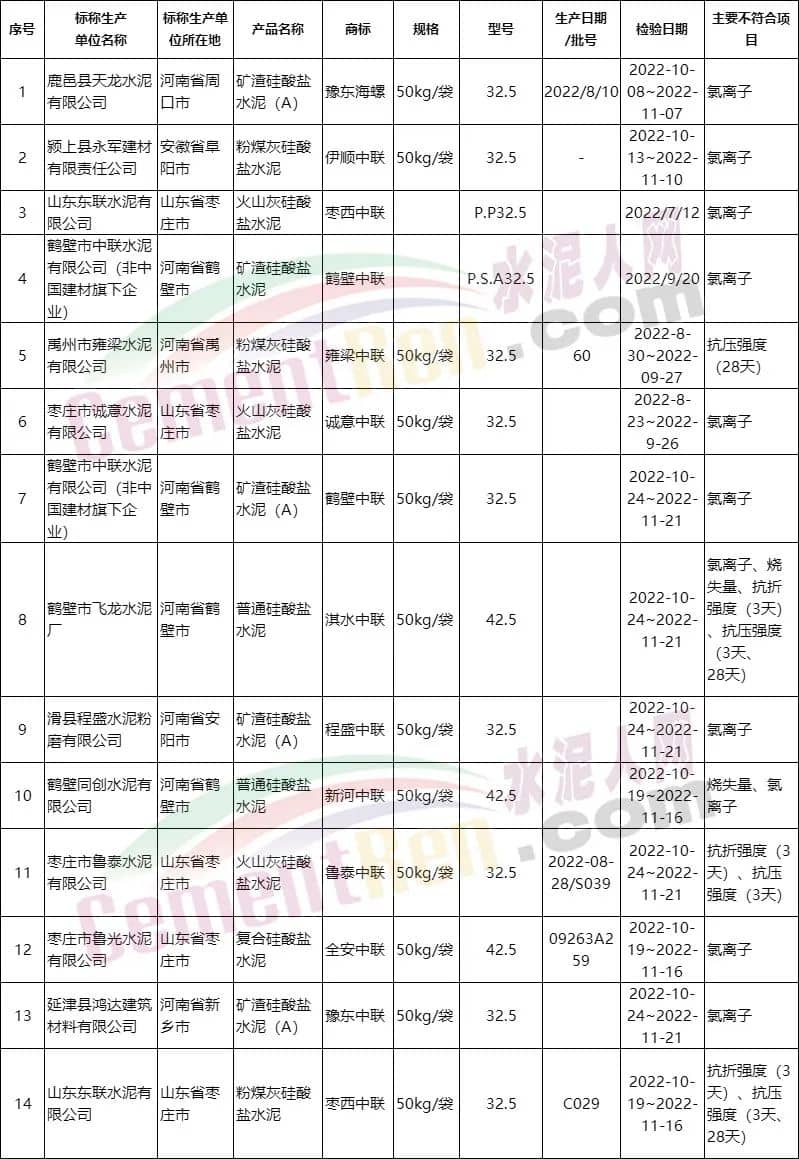 水泥人網近期公布的質量萬里行不合格水泥名單中包含13個批次帶有“中聯”字樣的品牌水泥和一個帶有“海螺”字樣的品牌水泥。