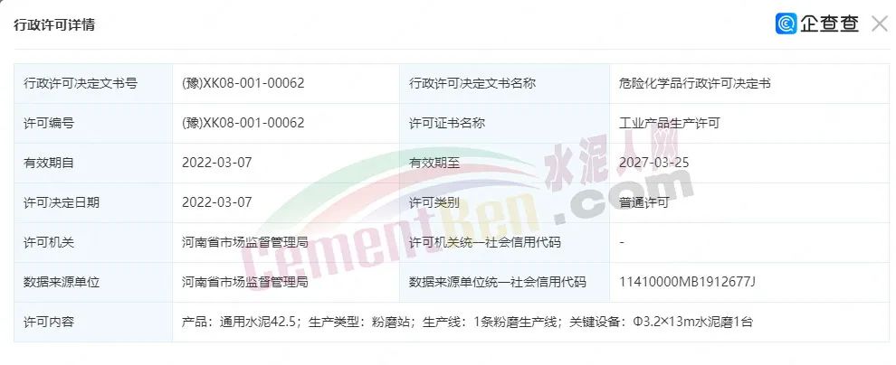 企業(yè)生產(chǎn)許可證編號(hào):(豫)XK08-001-00062,有效期至2027年3月25日。產(chǎn)品為通用水泥42.5;生產(chǎn)類(lèi)型為粉磨站;擁有一條粉磨生產(chǎn)線(xiàn);關(guān)鍵設(shè)備為Ф3.2╳13m水泥磨1臺(tái)。