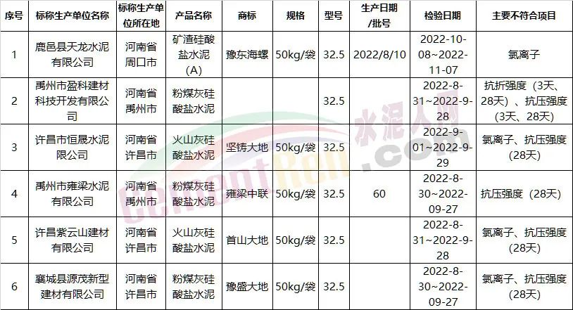不合格品抽檢產(chǎn)品分別為礦渣硅酸鹽水泥(A)、粉煤灰硅酸鹽水泥、火山灰硅酸鹽水泥;標(biāo)稱(chēng)單位分別為鹿邑縣天龍水泥有限公司、禹州市盈科建材科技開(kāi)發(fā)有限公司、許昌市恒晟水泥有限公司、禹州市雍梁水泥有限公司、許昌紫云山建材有限公司、襄城縣源茂新型建材有限公司,主要不符合項(xiàng)目為氯離子、抗壓,抗折強(qiáng)度。不合格品商標(biāo)分別為豫東海螺、堅(jiān)鑄大地、雍梁中聯(lián)、首山大地、豫盛大地。