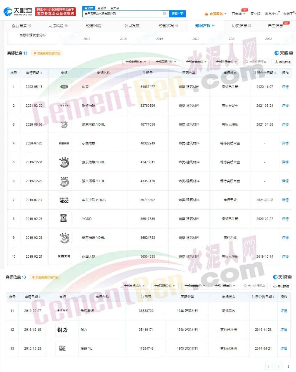 水泥人網(wǎng)注意到,鹿邑縣天龍水泥有限公司旗下共有13條注冊(cè)商標(biāo)信息,其中“豫東海螺”相關(guān)兩條為無(wú)效商標(biāo),一條為等待實(shí)質(zhì)審查階段。另有一條為“豫東海鏍”信息已注冊(cè)。