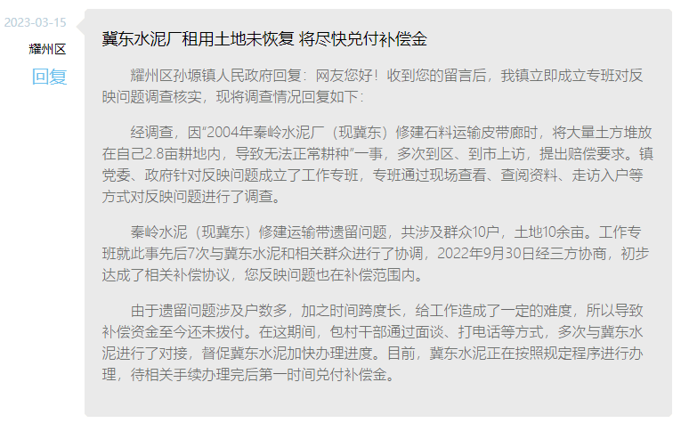 秦嶺水泥(現(xiàn)冀東)修建運輸帶遺留問題,共涉及群眾10戶,土地10余畝。工作專班就此事先后7次與冀東水泥和相關(guān)群眾進(jìn)行了協(xié)調(diào),2022年9月30日經(jīng)三方協(xié)商,初步達(dá)成了相關(guān)補償協(xié)議,網(wǎng)友反映問題也在補償范圍內(nèi)。
