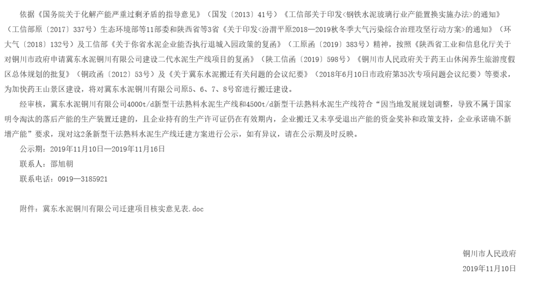 據(jù)水泥人網(wǎng)了解,早在2019年陜西銅川市人民政府發(fā)布《關(guān)于冀東水泥銅川有限公司新型干法熟料水泥生產(chǎn)線項目遷建的公示》稱,為加快藥王山景區(qū)建設(shè),將對冀東水泥銅川有限公司原5、6、7、8號窯進(jìn)行搬遷建設(shè)。公示稱,冀東水泥銅川有限公司4000t/d新型干法熟料水泥生產(chǎn)線和4500t/d新型干法熟料水泥生產(chǎn)線符合“因當(dāng)?shù)匕l(fā)展規(guī)劃調(diào)整,導(dǎo)致不屬于國家明令淘汰的落后產(chǎn)能的生產(chǎn)裝置遷建的,且企業(yè)持有的生產(chǎn)許可證仍在有效期內(nèi),企業(yè)搬遷又未享受退出產(chǎn)能的資金獎補和政策支持,企業(yè)承諾確不新增產(chǎn)能”要求。
