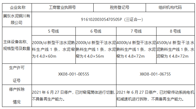 據(jù)了解,早在2021年9月26日銅川市人民政府就發(fā)布了《關(guān)于冀東水泥銅川有限公司5、6、7、8號 生產(chǎn)線停產(chǎn)拆除的公告》公告提到,經(jīng)實地核查,冀東水泥銅川有限公司新建的萬噸水泥熟料生產(chǎn)線已于2021年6月28日點火投產(chǎn),該公司產(chǎn)能置換后5、6號生產(chǎn)線2021年6月27日停產(chǎn),已對窯尾筒體進(jìn)行切割,不具備再生產(chǎn)能力。7、8號生產(chǎn)線2021年6月27日停產(chǎn),已對窯傳動系統(tǒng)電機和減速機進(jìn)行拆除,不具備再生產(chǎn)能力。