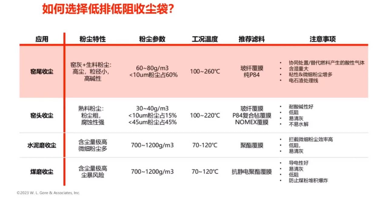選擇低排低阻收塵濾袋首先需要考慮工藝點粉塵的特性,含塵量,粉塵粒徑,工況溫度(極限溫度和持續工作溫度)。再根據工藝特點有針對性地選擇,如是否有協同處置?是否使用替代燃料,是否添加鋼渣,電石渣、化工廢渣等?以判斷粉塵中的油氣、黏性是否會引起煙氣的酸堿度、濕度的變化。另外,窯頭、窯尾、水泥磨、煤磨各點位因粉塵的特性的不同對上述參數的要求各有不同。