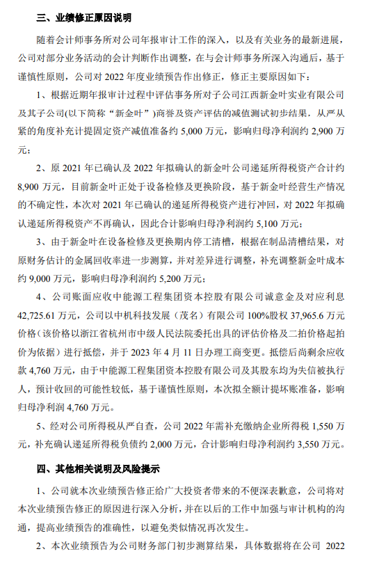 對于此次業績修正,金圓股份解釋稱有五大原因,前三點均與旗下子公司江西新金葉實業有限公司及其子公司有關。