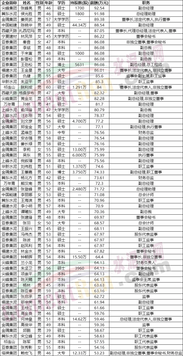 反觀水泥行業(yè),已公布薪酬的252位高管中,年薪超過500萬的高管為零,年薪超過200萬的僅13位。其中年薪最高的是天山股份副董事長(zhǎng)肖家祥,薪酬為385.7萬元;第二位是華新水泥李葉青薪酬為359.5萬元,同時(shí)持華新水泥股票81.59萬股。按照4月28日華新水泥最新股價(jià)14.75元計(jì)算,81.59萬股相當(dāng)于1200多萬元。按此計(jì)算拿錢最多的還是華新水泥總裁李葉青。