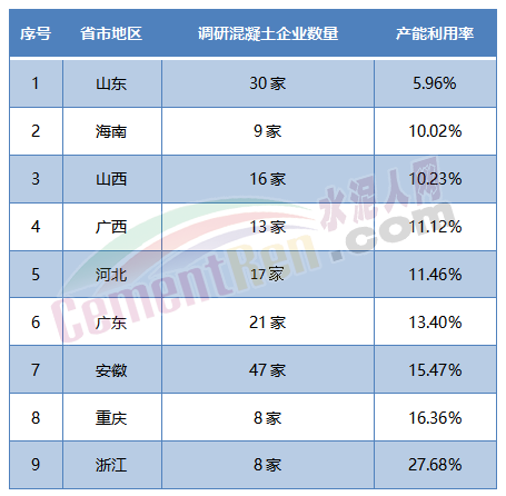 水泥市場的低迷,從下游各地混凝土企業產能利用率情況也可見其一斑。