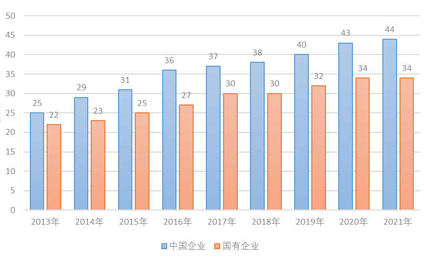 圖2 2013年—2021年中國企業、國有企業入圍《世界品牌500強》數量。資料來源:世界品牌實驗室網站,http://www.worldbrandlab.com。