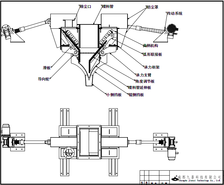 該裝置通過曲柄連桿機構(gòu)帶動調(diào)節(jié)流量板沿輥子圓周弧形移動,調(diào)節(jié)板距離輥面間距一定,不受開閉大小影響,保證在輥子徑向方向?qū)ξ锪系拿荛];獨有的輥子端面?zhèn)葥醢宀捎秒p層擋料,防止物料溢散,從而保證擠壓腔內(nèi)料床的穩(wěn)定性,提高料床密實度,改善輥壓機擠壓效率!