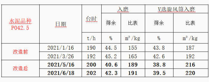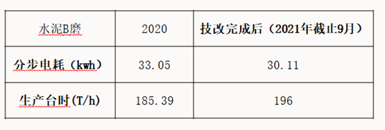 在相同的質(zhì)量控制指標(biāo)前提下,輥壓機改造后的聯(lián)合粉磨系統(tǒng)產(chǎn)量由223.14t/h提高至235.83t/h,增產(chǎn)幅度12.69%。粉磨電耗由33.88kWh/t降至32.6kWh/t,電耗降低了1.22 kWh/t實現(xiàn)清潔生產(chǎn);