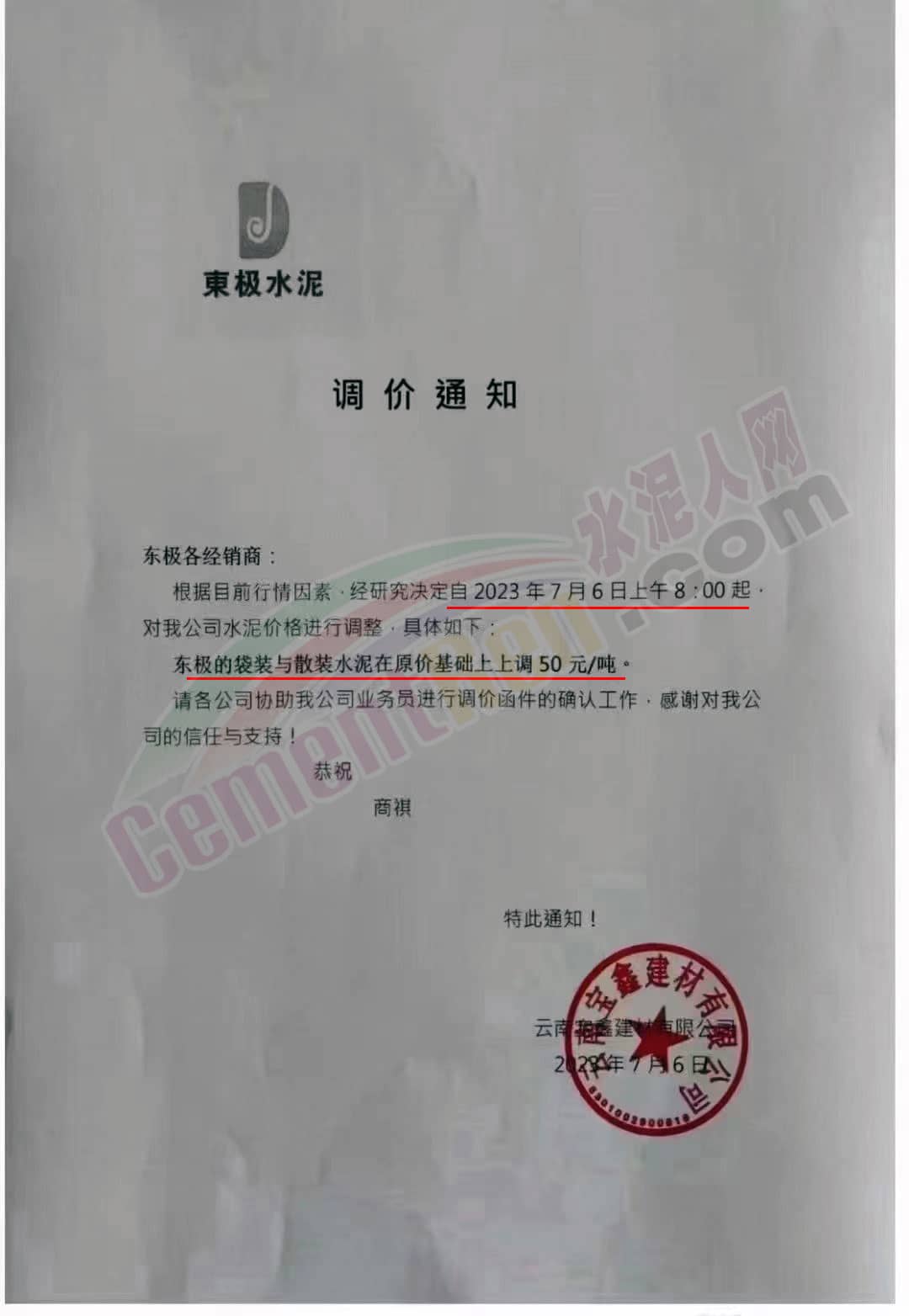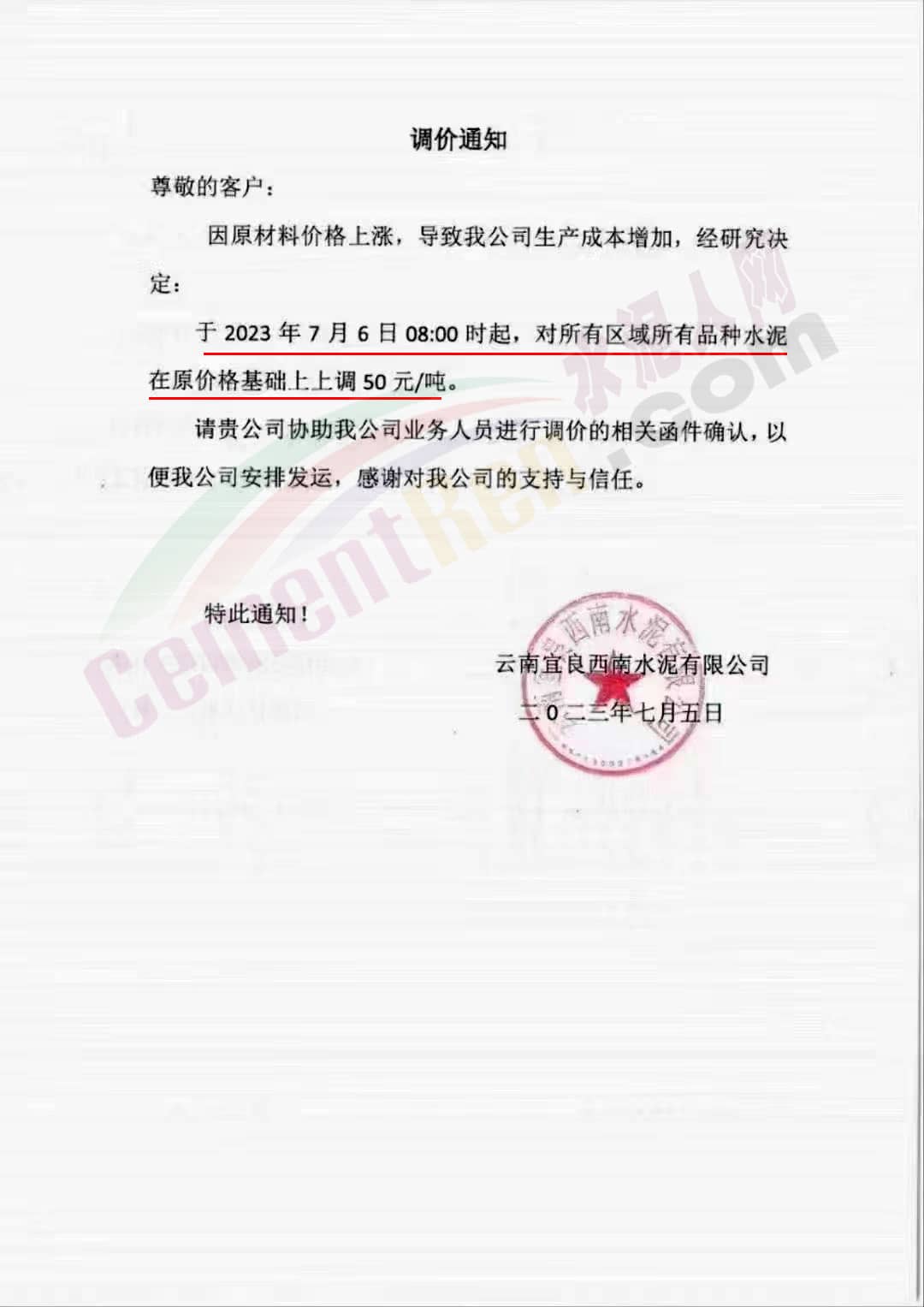 云南宜良西南水泥有限公司通知,因原材料價(jià)格上漲,導(dǎo)致公司生產(chǎn)成本增加,經(jīng)研究決定:于2023年7月6日8時(shí)起,對所有區(qū)域所有品種水泥在原價(jià)格基礎(chǔ)上上調(diào)50元/噸。