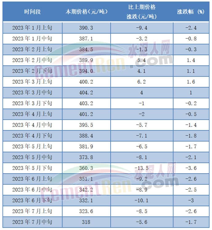 2023年7月中旬流通領域普通硅酸鹽水泥(P.O 42.5)散裝水泥報價318元/噸,同比上年同期下跌54.2元/噸,跌幅14.34%。