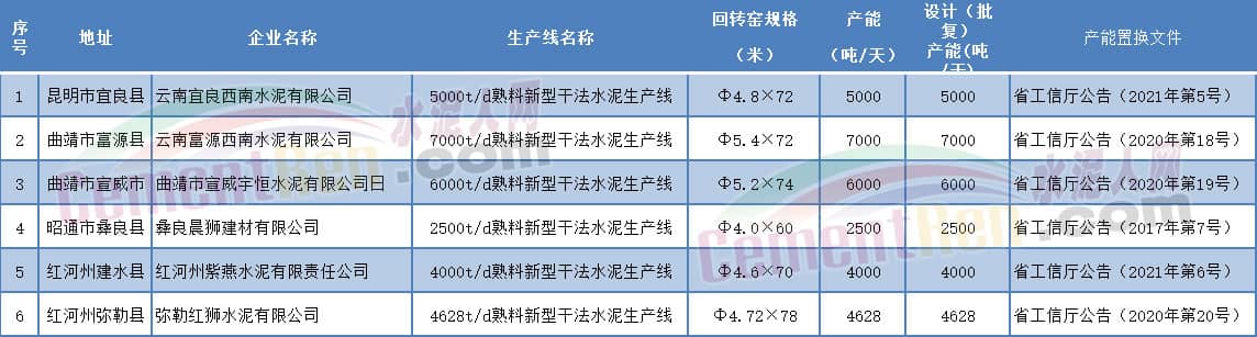 另外,云南工信廳發布的2022年云南省在建水泥熟料生產線清單中列出截至2022年末在建生產線共有6條。